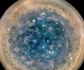 Researchers learned that Jupiter's signature bands disappear near its poles, revealing a scene of swirling storms up to the size of Mars towering above a bluish backdrop, according to the Southwest Research Institute statement.