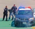 A man jumped a fence at Los Angeles International Airport and ran onto a runway where he reportedly did push-ups and tried to touch a plane preparing to take off. Police arrested him.