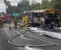Television news footage showed the bus engulfed in flames. Westbound lanes were closed while crews doused the fire.