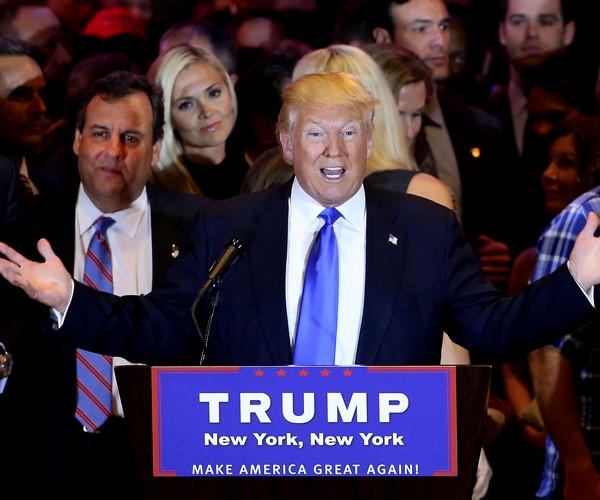 Republican presidential candidate Donald Trump speaks to supporters and the media with New Jersey Governor Chris Christie behind him at Trump Towers following the conclusion of primaries Tuesday in northeastern states on April 26, 2016 in New York, New York. Trump again gained more delegates to move him closer to the Republican presidential nomination. (Spencer Platt/Getty Images)