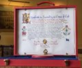 The document, illuminated on vellum, features a design to the left of the text that incorporates a red dragon, the symbol of Wales. The design to the right features a rose, the national flower of the United States.