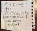 "This parking is for Veterans, lady. Learn to read [and] have some respect," the note read, according to the television station.