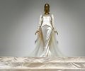 A late 19th-century, satin-and-chiffon ballgown begins the show, its intricate embroidery of metallic threads, golden beads and sequins evoking sunbeams radiating from clouds. But the “cloud dress” by influential English designer Charles Frederick Worth is doomed, due to deterioration of the vertical threads — “there’s nothing we can do about it,” Bolton says. Except perhaps to recreate it digitally: On a screen nearby, an animated “Pepper’s ghost” illusion that took nine months to perfect shows the gown dancing at a ball. The gown was donated by relatives of Caroline Schermerhorn Astor, played on HBO’s “The Gilded Age” by Donna Murphy.