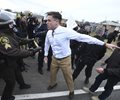 Police in riot gear quickly stepped in to break up the altercation, handcuffing six or seven people, then forming a skirmish line along the roadside to prevent further clashes.