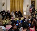 “We welcome everyone back," he told a crowd of about 150 seated in the East Room, decked out with Christmas trees and wreaths. Guests included Vice President Kamala Harris, House Speaker Nancy Pelosi, Caroline Kennedy, Mikhail Baryshnikov, Chita Rivera, Steve Martin and Herbie Hancock.