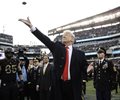 Trump sat on the Army side in the first half and crossed the field to the Navy side at halftime. Trump officiated the coin toss and was introduced by public address announcer Dan Baker to a cheering crowd.