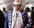 Next is Rebel, the glam-rock artist arrived in a blue jacket emblazoned with the words "Keep America Great" and "Trump 2020" over a white blouse, pants, and high-heeled knee-high boots.
