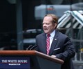 The actress drove outside CNN’s New York City offices in a motorized White House briefing room podium that she had used before in "Saturday Night Live" sketches. The network posted a video on Facebook.