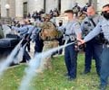 "As a result of actions that occurred within the rally, on courthouse grounds, the assembly reached a level of conduct that led to the rally being deemed unsafe and unlawful by unified command," the police statement said. Following warnings that force would be used if people did not disperse after 5 minutes, the department said officers used the pepper spray after several people still remained.