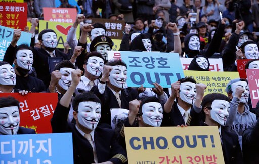 Hiding their faces with identical masks to obscure their identities, the protesters shouted slogans against the Cho family. Many pilots were wearing uniforms and ties.