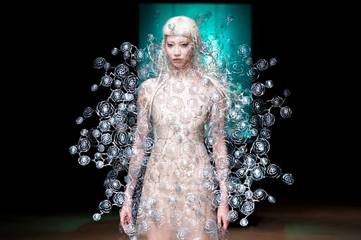 The water theme dripped out into the surreal, brooding couture creations that revisited the Dutch wunderkind's signature fusion of organic forms with technology and mechanics. White gowns, constructed of tendrils or fibers, provoked myriad interpretations — evoking simultaneously the lines of a sound wave, the rippling sea or the gills of a fish.