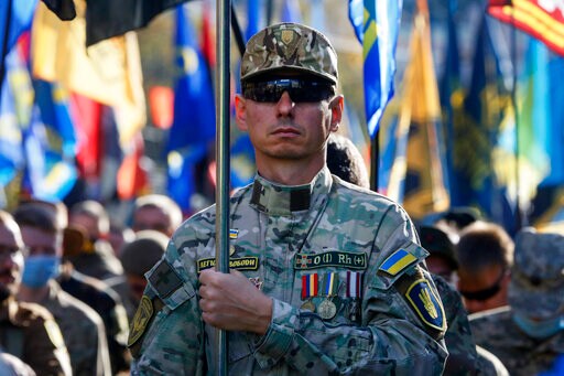 KYIV, Ukraine (AP) — About 5,000 ultra-right activists marched across the Ukrainian capital Wednesday to denounce a cease-fire in the conflict with Russia-backed separatists in eastern Ukraine, leaving an anti-Semitic banner pinned to the presidential office's entrance.