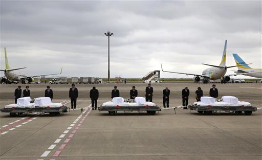 TOKYO (AP) — Under gray skies, the bodies of the seven Japanese killed in a militant attack in Bangladesh returned to home soil early Tuesday morning.