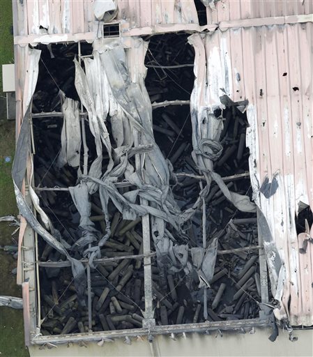 The building that exploded was storing compressed nitrogen, oxygen, Freon and air, a statement issued by the U.S. Army Japan said. Photos taken after daybreak and released by the Army show dozens of gray canisters lying on the floor, and what looks like mangled storage racks.