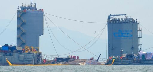 Workers had hoped to finish raising the ferry by morning. Lee said the ferry has so far been lifted 24 meters (79 feet) from the seafloor, but needs to be elevated 11 meters (36 feet) further so its upper side reaches about 13 meters (42 feet) above the surface. Salvage crews will then begin loading the ferry onto a semi-submersible, heavy-lift vessel that will carry it to a port.