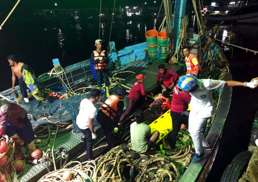 Thai media showed photos of people rescued from one of the boats in large rubber life rafts at sea, with fishing boats and churning water in the background. They also showed survivors being lifted from the rafts and sitting in their life jackets amid ropes on the deck of what appears to be a fishing trawler.