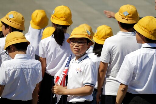 Trump stood at attention alone atop a platform before he walked along a red-carpeted route to review troops. He also passed in front of a group of schoolchildren feverishly waving U.S. and Japanese flags.