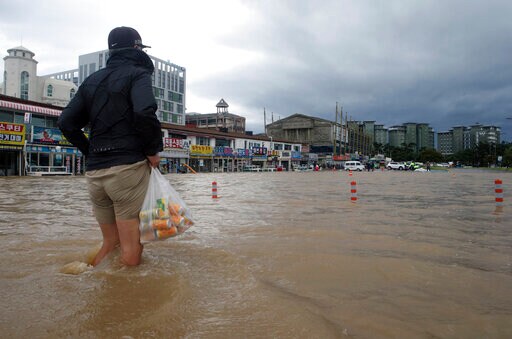 More than 2,400 South Koreans evacuated their homes due to the typhoon, which damaged or flooded dozens of homes and vehicles, ripped off signboards and toppled scores of trees, utility poles and lampposts. A woman in the southern city of Busan died after being injured by shattered window glass.