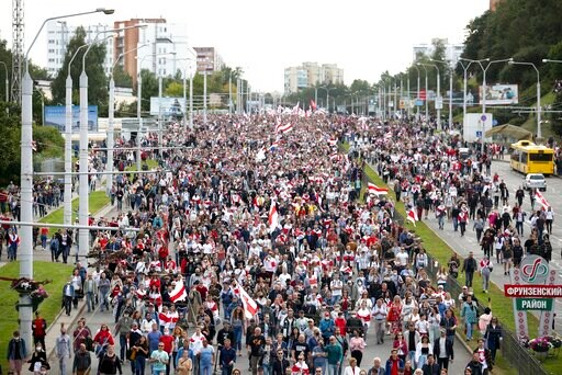 KYIV, Ukraine (AP) — More than 100,000 demonstrators calling for the authoritarian president of Belarus to resign marched through the capital of Minsk on Sunday as the daily protests that have gripped the nation entered their sixth week.