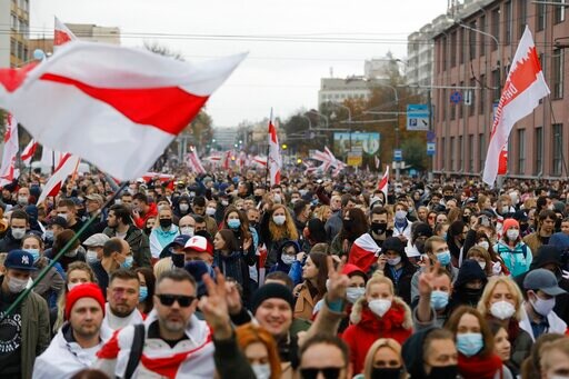 KYIV, Ukraine (AP) — Tens of thousands of protesters in Belarus swarmed the streets of the capital Sunday, pressing for the resignation of the country's authoritarian leader in what human rights activists described as the largest anti-government rally since late August.