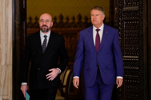Michel met with Romanian President Klaus Iohannis at Cotroceni Palace in Bucharest, where the two leaders discussed EU support for Ukraine, security issues in neighboring Moldova, and Romania's bid to join Europe’s ID check-free travel zone, also known as the Schengen area.