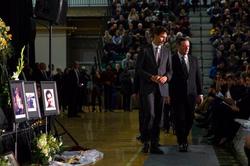 Speaking at a memorial with a capacity crowd of 2,300 in Edmonton, Alberta, Trudeau said he has learned many of the victims came to Canada in search of new opportunities for their families, but those families are now consumed by grief and outrage.