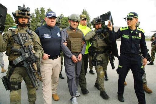 The former rural warlord, better known by his alias Otoniel, had stayed on the run for more than a decade by corrupting state officials and aligning himself with combatants on the left and right. He was transferred Wednesday in handcuffs and wearing a helmet and a bulletproof vest from a prison in Bogotá to a heavily guarded military transport air field.