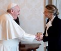 Pope Francis (left, is greeted by the Italy's Minister of Labour and Social Economy, Yolanda Díaz (right) in the Apostolic Library of the Vatican, on 11 December 2021 in Rome to discuss COVID-19 and other issues. (AP)