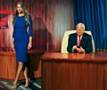 Trump’s figure, sporting his signature red tie, is seated at a desk with the former president looking down and checking out his smartphone, while a sleek wax figure of former first lady Melania stands by his side in a cobalt blue dress, her classic look during the 2016 presidential campaign.