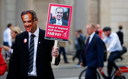LONDON (AP) — Striking employees at the Bank of England are wearing comical masks depicting Governor Mark Carney as they picket outside the institution demanding better pay.