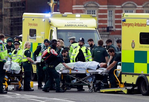 LONDON (AP) — A knife-wielding man went on a deadly rampage in the heart of Britain's seat of power Wednesday, plowing a car into pedestrians on London's Westminster Bridge before stabbing a police officer to death inside the gates of Parliament. Five people were killed, including the assailant, and 40 others were injured in what Prime Minister Theresa May condemned as a "sick and depraved terrorist attack."