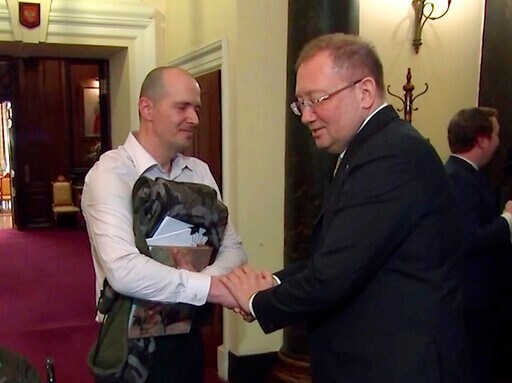 LONDON (AP) — A British man who survived exposure to a military grade nerve agent has questioned Russia's ambassador about the accidental poisoning that killed his girlfriend last year.