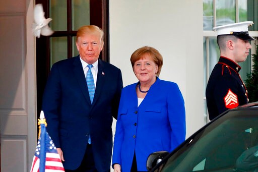 FRANKFURT, Germany (AP) — German Chancellor Angela Merkel says she and the leaders of France and Britain are ready to push back if the Trump administration does not permanently exempt the European Union from new import taxes on aluminum and steel imports.