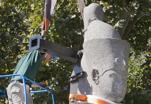 The museum erected the granite monuments Friday as a preview of its exhibition "Osiris: Mysteries of Submerged Egypt," opening Sept. 8. The show features nearly 300 artifacts, most of them discovered in the underwater excavations of French marine archaeologist Frank Goddio.