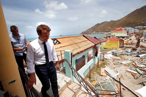 PARIS (AP) — That tie. He just won't take it off, even when picking his way in sweltering heat through the rubble left by Hurricane Irma on the French Caribbean island of St. Martin.