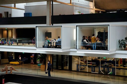 The vast space hums with energy and electronic devices, as its mostly youthful workers take breaks around multi-colored sofas, or bounce ideas off each other in shared meeting rooms.