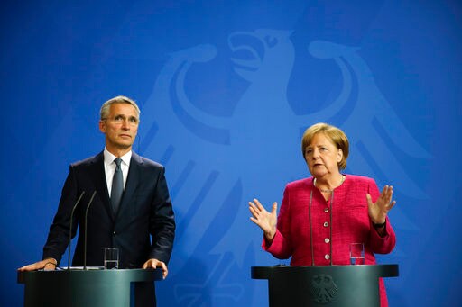 NATO members agreed in 2014 to "move toward the 2 percent guideline within a decade." Merkel said Berlin is complying with that, and added: "We accept this target, but we are also giving realistic information."