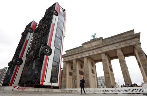 BERLIN (AP) — A Syrian-born artist has upended three buses next to Berlin's Brandenburg Gate, an installation meant to evoke the suffering of civilians in Syria.