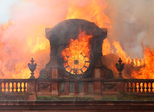 Flames engulfed the roof of the structure, destroying the rooftop clock, before spreading through the five-story building.