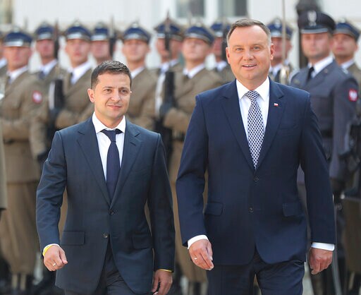 WARSAW, Poland (AP) — Ukrainian President Volodymyr Zelenskiy has been greeted by his Polish counterpart ahead of talks on topics including the policies of his government, appointed this week, and the country's ties with the European Union.