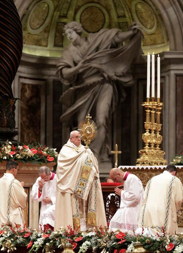 Francis made his way through the crowd to pray in front of the life-size Nativity scene following the traditional vespers, also called evening prayer, inside St. Peter's Basilica. Along the way, he stopped to kiss children on the cheek and shake hands with well-wishers, occasionally accepting small gifts that he handed off to his body guards. People in the crowd held up their smart phones and tablets to snap pictures of the pontiff.