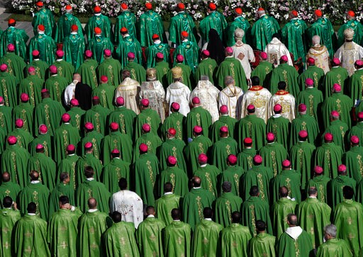 Francis celebrated Mass in St. Peter's Square with more than 200 priests, bishops and cardinals summoned to Rome for a monthlong meeting on proposing new ways to minister to today's young Catholics.