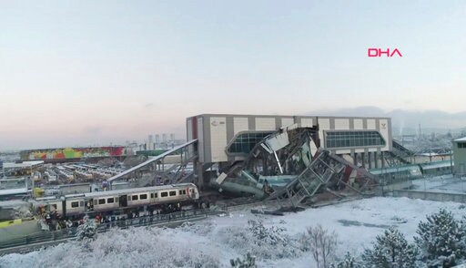 Anadolu Agency says two cars of the high-speed train derailed in the crash. The train was en route from Ankara to the central Turkish city of Konya.