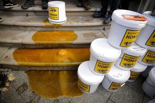 Sebastian and Camille Seusing poured a bucket of honey onto the ministry steps, saying it was contaminated with high levels of glyphosate that was sprayed onto fields near their apiculture business in Brandenburg state, which surrounds Berlin.
