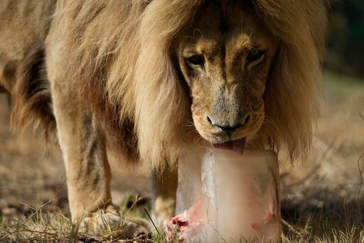 The 15-year-old Angolan lion eventually licks the ice before gnawing pieces of meat free.