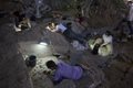 At the entrance to the cave, the skull of one of the early humans is slowly emerging from the rock sediment; it will be years before it is fully excavated.