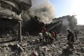GAZA CITY, Gaza Strip — Firefighters sprayed jets of water across twisted metal and jumbled concrete as flames roared from homes destroyed by an Israeli airstrike in the Jabaliya refugee camp.