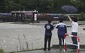 In Hiratsuka town, dozens of cars in a parking lot sat in water just below their windows. A pedestrian waded through floodwater as high as his thighs. In another Kanagawa town, Ninomiya, floodwater from a river stalled vehicles on a street and broken tree branches were stuck on a bridge over the swollen water.