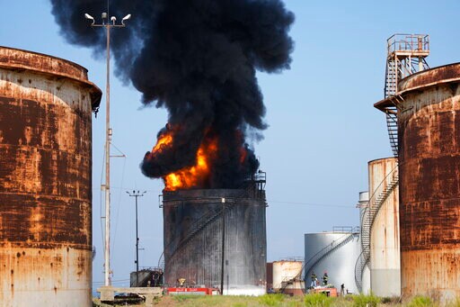 ZAHRANI, Lebanon (AP) — A huge fire broke out in a storage tank at one of Lebanon's main oil facilities in the country's south Monday, sending orange flames and a thick black column of smoke into the sky.