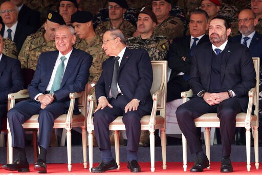 At the official celebrations earlier Friday, Hariri maintained a stern expression during the military parade, while President Michel Aoun and Parliament Speaker Nabih Berri exchanged smiles. The leaders exchanged a few words during the 30-minute parade of marching soldiers. There was no display of tanks or helicopters and no foreign dignitaries were in attendance.